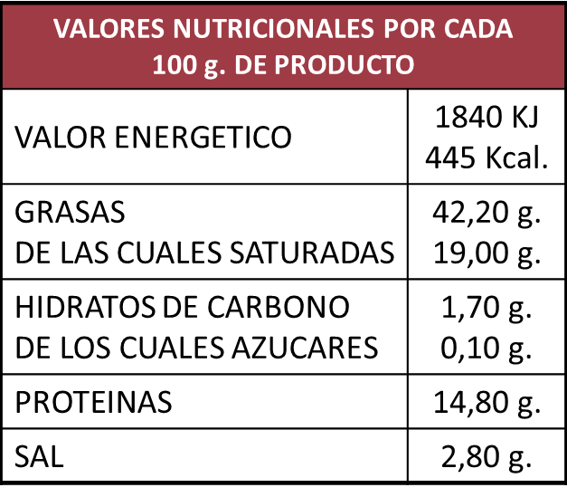 Ingredienes: Papada, panceta, hígado y sangre de cerdo, pimentón, ajo, sal, proteína de soja, almidón, potenciador del sabor E-621, conservadores E-202, E-262, antioxidante E-331 y estabilizador E-452i